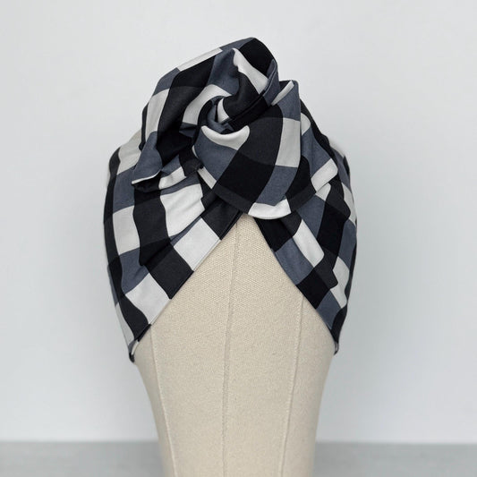 Extra Wide Adjustable Wire Headband, Black White Buffalo Plaid Print, Boho Wired Headband, Fabric Head Wrap, Turban, Bendable Scarf